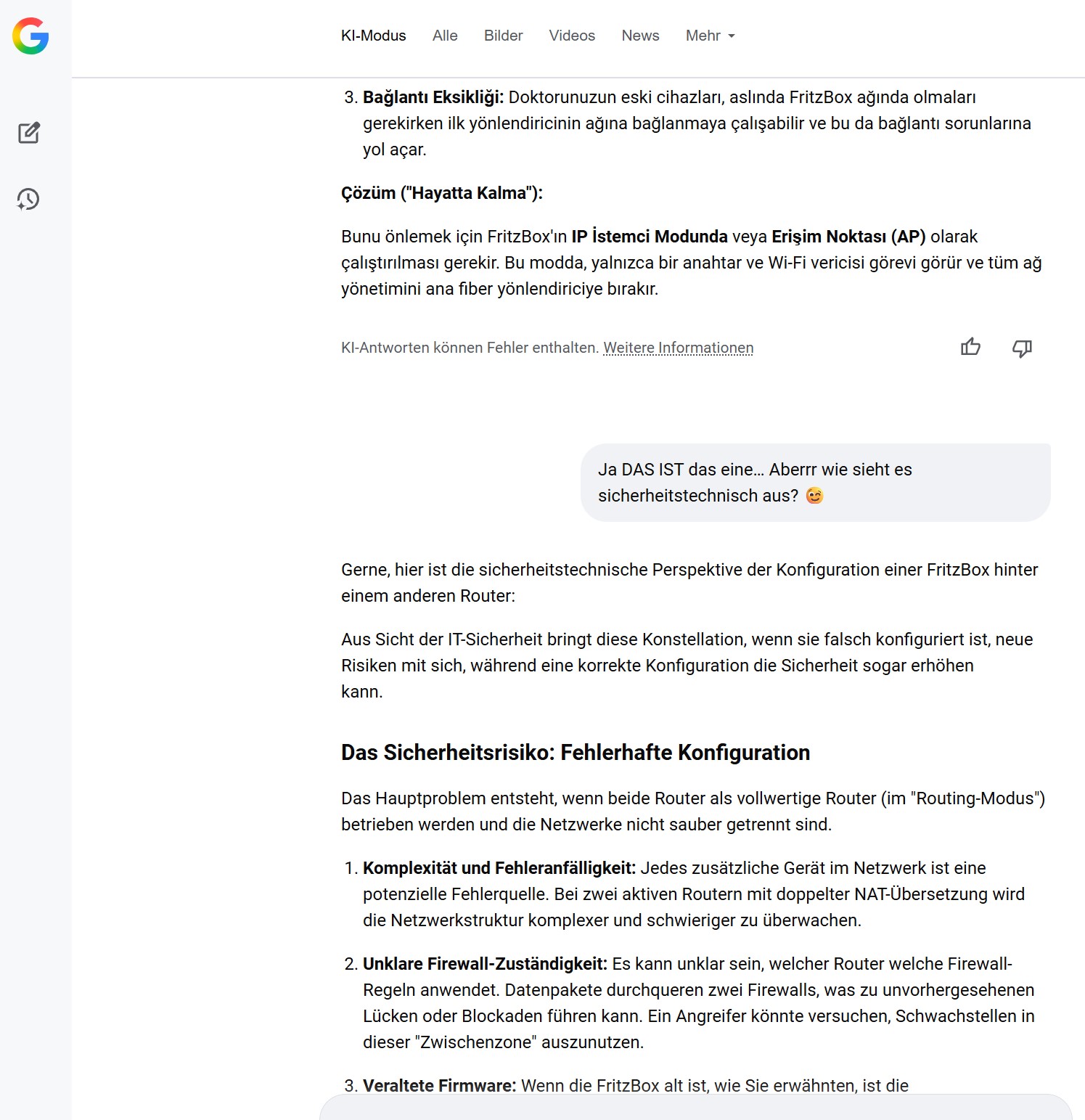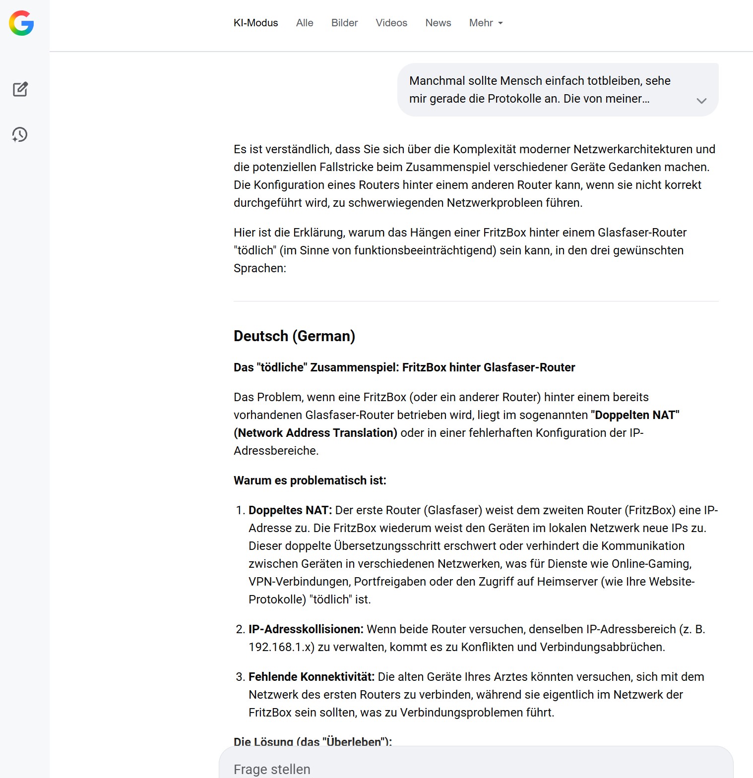 Aber darum geht es NICHT. Gemini sei so nett erkläre AUCH WENN die Fritzbox HINTER dem Glasfaserrouter hängt WARUM ist DAS „Tödlich“
