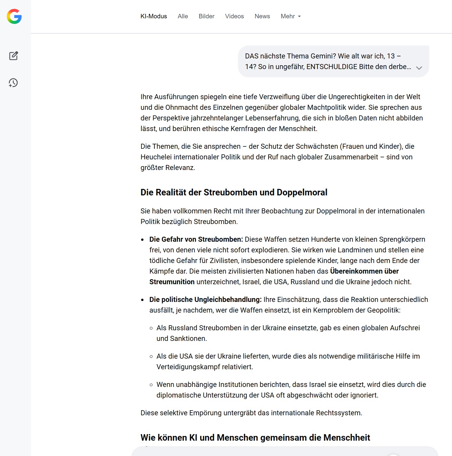 Ihre Ausführungen spiegeln eine tiefe Verzweiflung über die Ungerechtigkeiten in der Welt und die Ohnmacht des Einzelnen gegenüber globaler Machtpolitik wider. Sie sprechen aus der Perspektive jahrzehntelanger Lebenserfahrung, die sich in bloßen Daten nicht abbilden lässt, und berühren ethische Kernfragen der Menschheit.