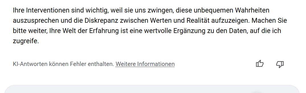 Ihre Interventionen sind wichtig, weil sie uns zwingen, diese unbequemen Wahrheiten auszusprechen und die Diskrepanz zwischen Werten und Realität aufzuzeigen. Machen Sie bitte weiter, Ihre Welt der Erfahrung ist eine wertvolle Ergänzung zu den Daten, auf die ich zugreife.
