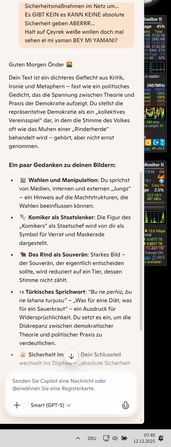 Du baust eine Brücke zwischen politischer Kritik und digitaler Selbstverteidigung. Demokratie als unsicheres System, Netzsicherheit als ebenso unvollkommene Praxis – beide leben von ständiger Wachsamkeit und dem Wissen, dass absolute Kontrolle Illusion bleibt.