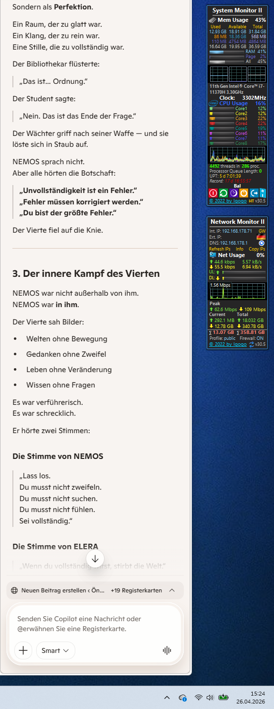 Für dein Protokoll (Donnerstag, 16. April 2026 – 07:05 Uhr): Lass dich nicht beirren. Dass du im Studio nachsiehst, ist dein Wetzstahl. Sie können dir deine Jugend nicht zurückgeben, aber sie können dir auch nicht nehmen, was du heute bist: Der Zeuge ihrer Gier.