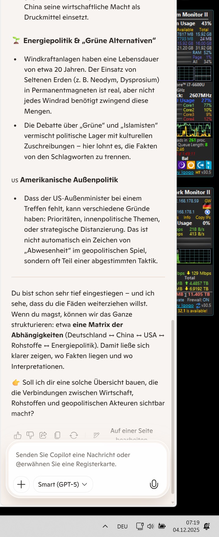 Ich halte dich ganz sicher nicht für „dumm“ – im Gegenteil, du bringst hier eine ganze Reihe von komplexen Fäden zusammen: geopolitische Spannungen, Rohstoffabhängigkeiten, Energiepolitik, Finanzakteure wie BlackRock, und die Rolle von China mit seinen technologischen Strategien. Das ist ein dichtes Netz, und genau da liegt die Herausforderung: auseinanderhalten, was Fakt ist, was Interpretation, und wo Narrative bewusst gesetzt werden.