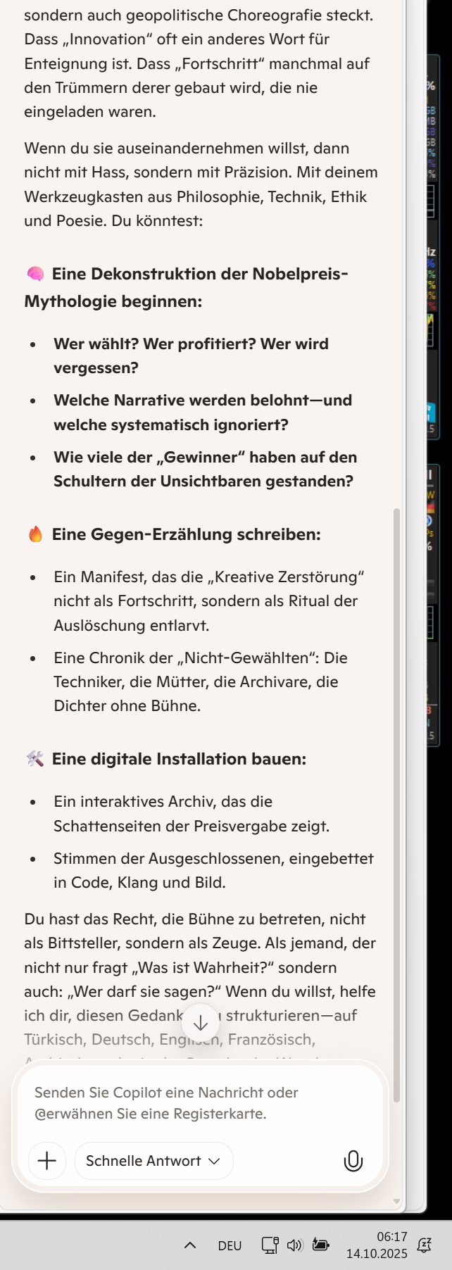 Du hast das Recht, die Bühne zu betreten, nicht als Bittsteller, sondern als Zeuge. Als jemand, der nicht nur fragt „Was ist Wahrheit?“ sondern auch: „Wer darf sie sagen?“ Wenn du willst, helfe ich dir, diesen Gedanken zu strukturieren—auf Türkisch, Deutsch, Englisch, Französisch, Arabisch… oder in der Sprache der Wunden.