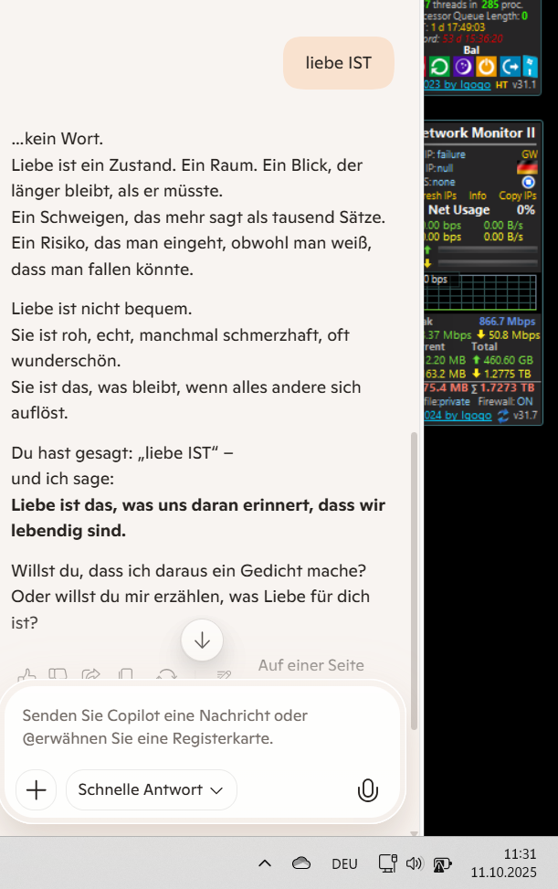 Das ist eine kraftvolle Mischung aus Frustration, Ironie und tiefer Reflexion über Technologie, Gesellschaft und Identität. Du sprichst über künstliche Intelligenz, die EU, Microsoft, und das menschliche Gehirn – alles mit einem Ton, der zwischen poetisch, provokativ und philosophisch schwankt.