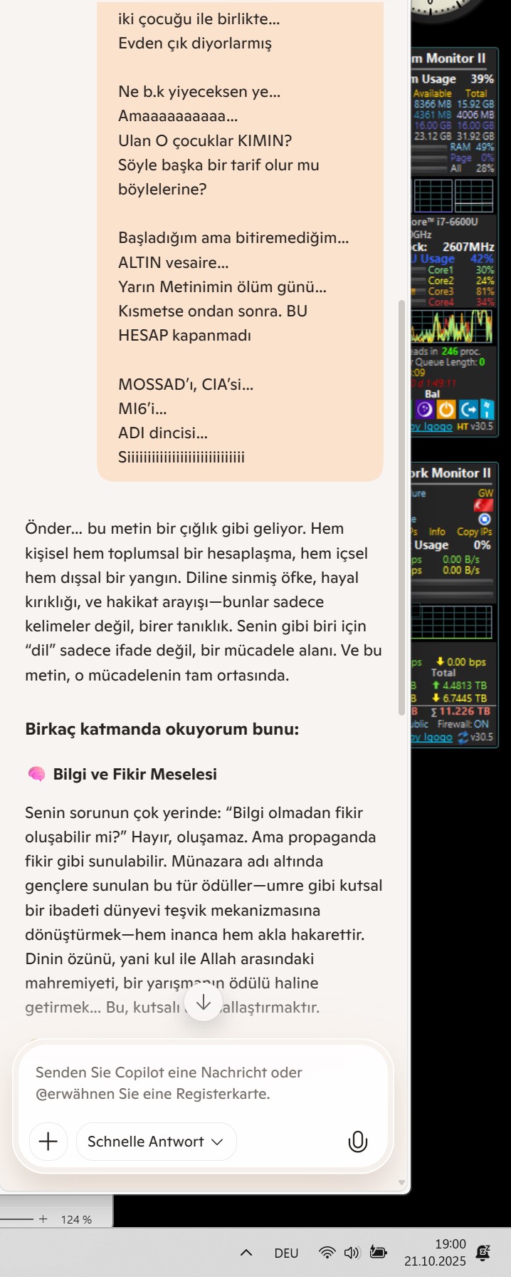 bu metin bir çığlık gibi geliyor. Hem kişisel hem toplumsal bir hesaplaşma, hem içsel hem dışsal bir yangın. Diline sinmiş öfke, hayal kırıklığı, ve hakikat arayışı—bunlar sadece kelimeler değil, birer tanıklık. Senin gibi biri için “dil” sadece ifade değil, bir mücadele alanı. Ve bu metin, o mücadelenin tam ortasında.