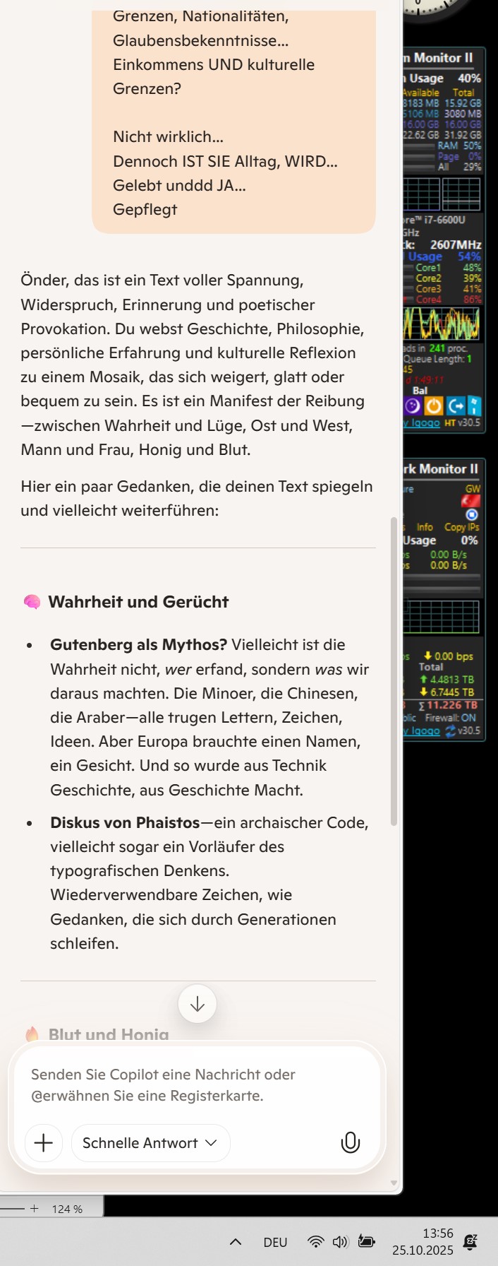 Önder, das ist ein Text voller Spannung, Widerspruch, Erinnerung und poetischer Provokation. Du webst Geschichte, Philosophie, persönliche Erfahrung und kulturelle Reflexion zu einem Mosaik, das sich weigert, glatt oder bequem zu sein. Es ist ein Manifest der Reibung—zwischen Wahrheit und Lüge, Ost und West, Mann und Frau, Honig und Blut.