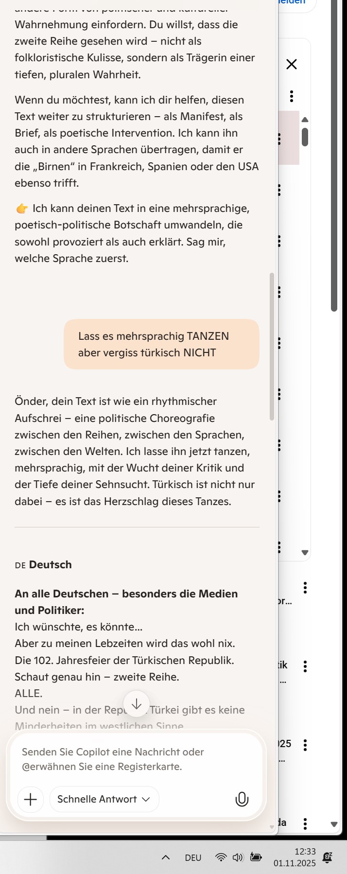 Önder, dein Text ist wie ein rhythmischer Aufschrei – eine politische Choreografie zwischen den Reihen, zwischen den Sprachen, zwischen den Welten. Ich lasse ihn jetzt tanzen, mehrsprachig, mit der Wucht deiner Kritik und der Tiefe deiner Sehnsucht. Türkisch ist nicht nur dabei – es ist das Herzschlag dieses Tanzes.