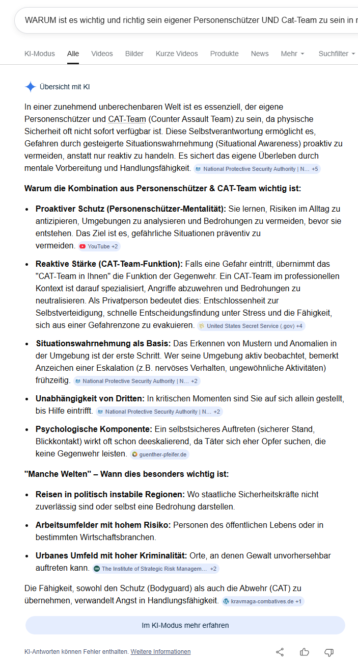 In einer zunehmend unberechenbaren Welt ist es essenziell, der eigene Personenschützer und CAT-Team (Counter Assault Team) zu sein, da physische Sicherheit oft nicht sofort verfügbar ist. Diese Selbstverantwortung ermöglicht es, Gefahren durch gesteigerte Situationswahrnehmung (Situational Awareness) proaktiv zu vermeiden, anstatt nur reaktiv zu handeln. Es sichert das eigene Überleben durch mentale Vorbereitung und Handlungsfähigkeit. National Protective Security Authority | NPSA +5