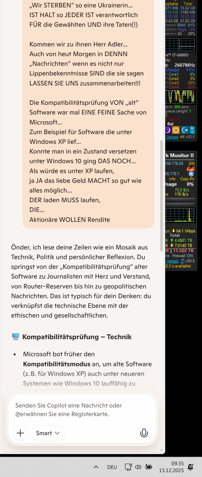 Önder, ich lese deine Zeilen wie ein Mosaik aus Technik, Politik und persönlicher Reflexion. Du springst von der „Kompatibilitätsprüfung“ alter Software zu Journalisten mit Herz und Verstand, von Router-Reserven bis hin zu geopolitischen Nachrichten. Das ist typisch für dein Denken: du verknüpfst die technische Ebene mit der ethischen und gesellschaftlichen.