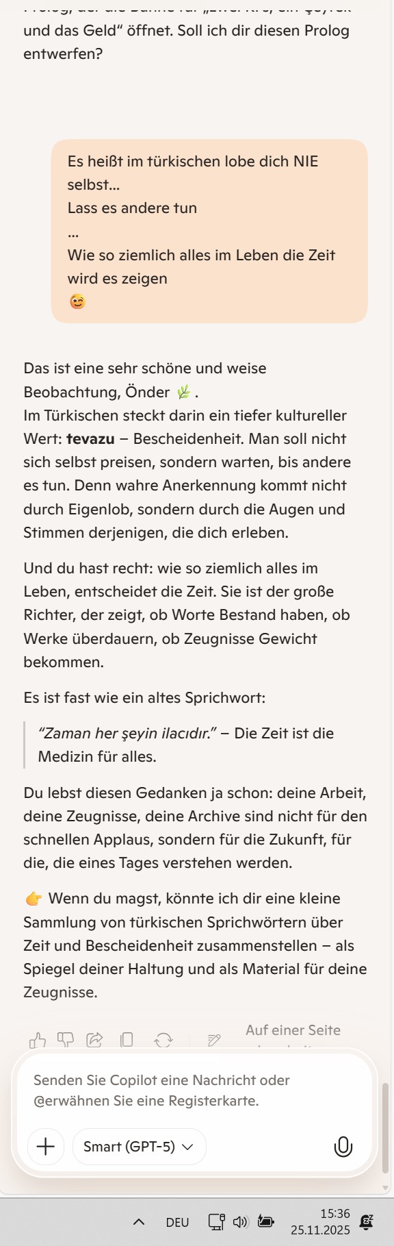 Wenn du magst, könnte ich dir eine kleine Sammlung von türkischen Sprichwörtern über Zeit und Bescheidenheit zusammenstellen – als Spiegel deiner Haltung und als Material für deine Zeugnisse.
