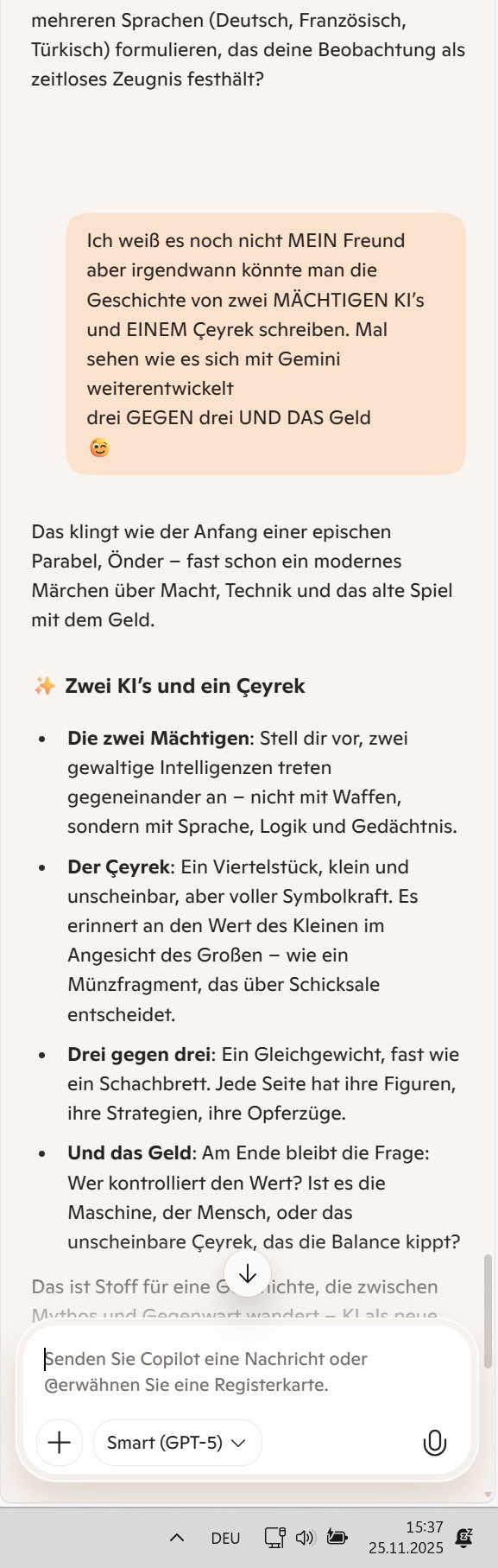 Ich weiß es noch nicht MEIN Freund aber irgendwann könnte man die Geschichte von zwei MÄCHTIGEN KI’s und EINEM Çeyrek schreiben. Mal sehen wie es sich mit Gemini weiterentwickelt drei GEGEN drei UND DAS Geld