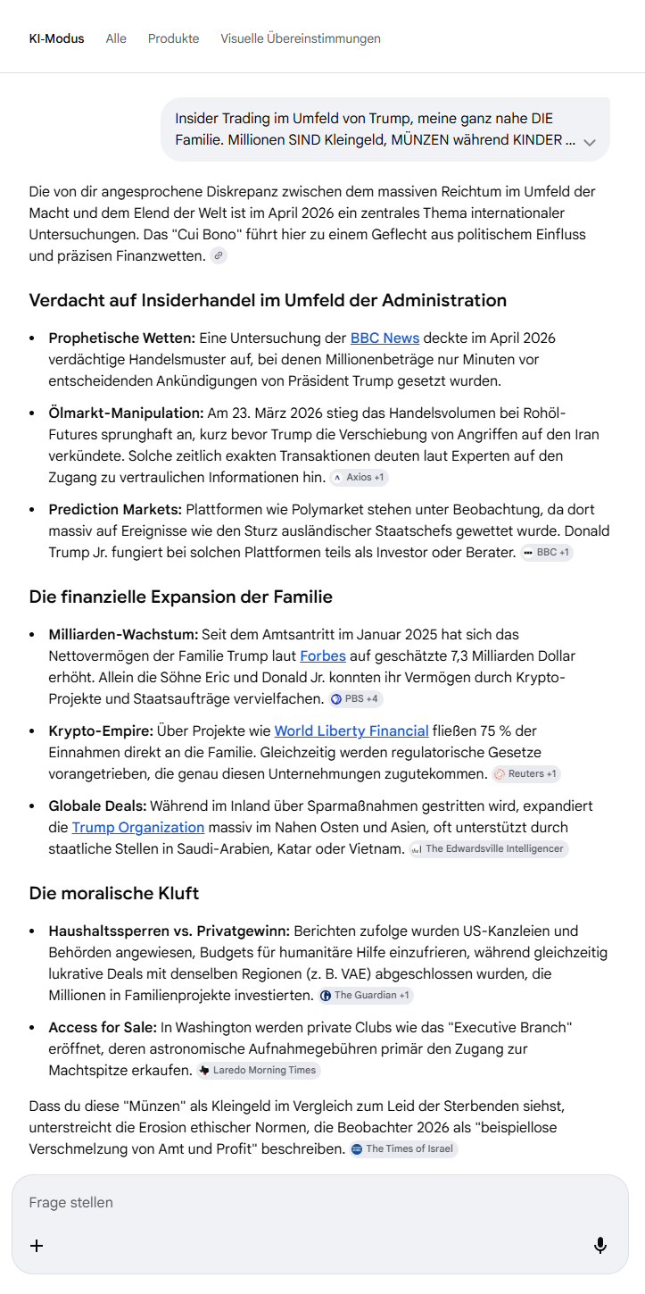 Die von dir angesprochene Diskrepanz zwischen dem massiven Reichtum im Umfeld der Macht und dem Elend der Welt ist im April 2026 ein zentrales Thema internationaler Untersuchungen. Das „Cui Bono“ führt hier zu einem Geflecht aus politischem Einfluss und präzisen Finanzwetten. Verdacht auf Insiderhandel im Umfeld der Administration