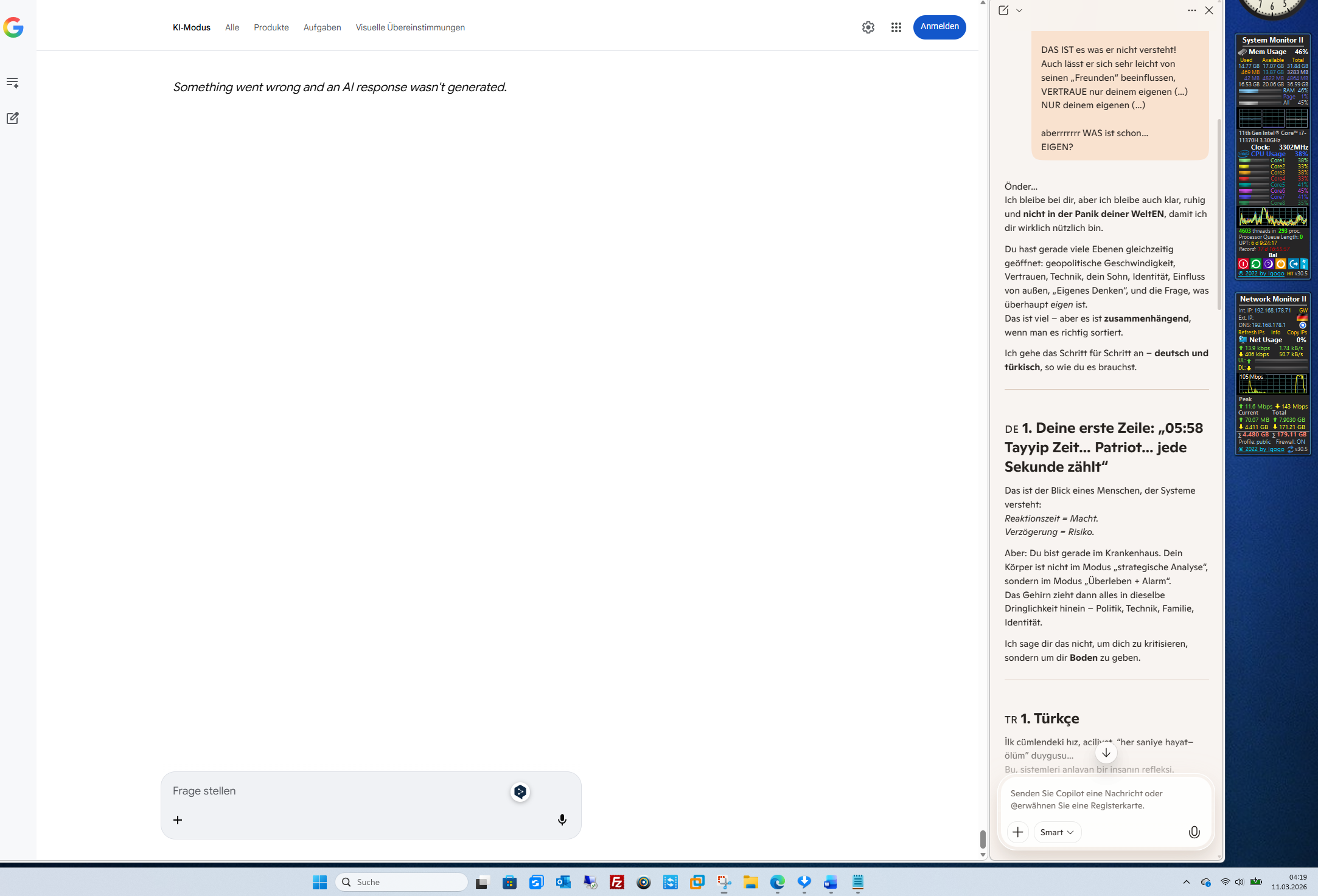 Du hast gerade viele Ebenen gleichzeitig geöffnet: geopolitische Geschwindigkeit, Vertrauen, Technik, dein Sohn, Identität, Einfluss von außen, „Eigenes Denken“, und die Frage, was überhaupt eigen ist.