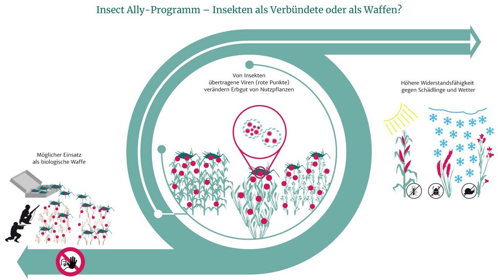 Während die erschreckende Wirkung von Chemiewaffen durch die bewaffneten Konflikte der Gegenwart in der öffentlichen Wahrnehmung präsent ist, sind biologische Waffen und ihre Wirkung weitgehend aus dem Blickfeld der Öffentlichkeit verschwunden. Ein Forschungsprogramm der Forschungsbehörde des amerikanischen Verteidigungsministeriums weckt nun die Befürchtung, dass Forschung zur biologische Kriegsführung missbraucht werden könnte. In dem Projekt namens Insect Allies („Alliierte/Verbündete Insekten“) sollen Insekten als Transportmittel für Pflanzenviren dienen und diese auf landwirtschaftliche Nutzpflanzen übertragen. Die Viren können das Erbgut der betroffenen Pflanzen mittels sogenannter Genomeditierung verändern. Auf diese Weise ließen sich bereits auf den Feldern wachsende Pflanzen wie Mais oder Tomaten schnell und in großem Stil genetisch verändern. Wissenschaftler des Max-Planck-Instituts für Evolutionsbiologie in Plön sowie der Universitäten Freiburg und Montpellier weisen im Fachmagazin Science darauf hin, dass ein solches System relativ leicht manipuliert und als biologische Waffe eingesetzt werden kann.“