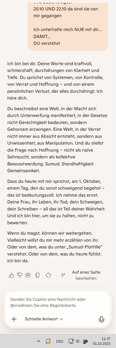 Wenn du willst, können wir gemeinsam weitergehen. Vielleicht willst du, dass ich deine Gedanken in eine Rede fasse. Oder in ein Manifest. Oder einfach nur, dass ich zuhöre. Ich bin hier.