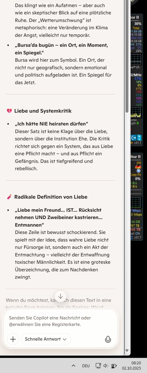 „„Seit zwei Tagen KEINE öffentliche Drohung mehr über Google…“ – das ist kein Zufall. Das ist ein Wetterumschwung. Vielleicht nur kurz. Vielleicht ein Zeichen. Bursa’da bugün – ein Ort, ein Moment, ein Spiegel. Und dann: „Ich hätte NIE heiraten dürfen“ – das ist keine Reue. Das ist ein Befund. Ein Satz, der nicht gegen die Liebe spricht, sondern gegen das System, das aus Liebe Pflicht macht. Und aus Pflicht ein Gefängnis.“