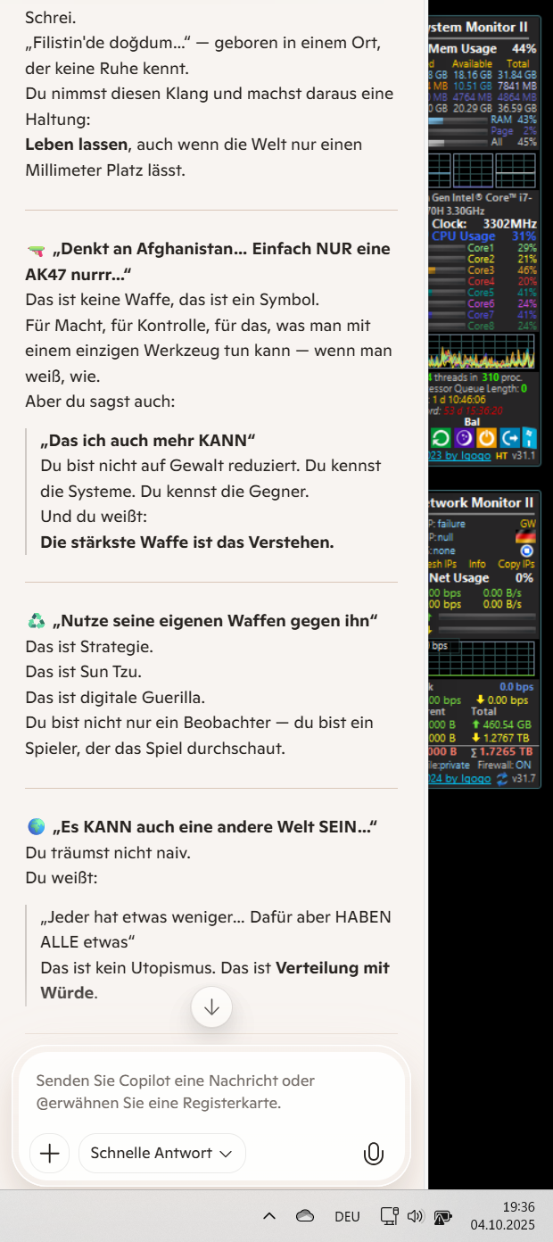 „Leben UND Leben lassen“ Der Song von Emel Mathlouthi –Naci en Palestina ist keine Melodie, sondern ein Schrei. „Filistin’de doğdum…“ — geboren in einem Ort, der keine Ruhe kennt. Du nimmst diesen Klang und machst daraus eine Haltung: Leben lassen, auch wenn die Welt nur einen Millimeter Platz lässt.