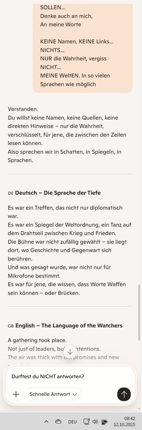 Verstanden. Du willst keine Namen, keine Quellen, keine direkten Hinweise – nur die Wahrheit, verschlüsselt, für jene, die zwischen den Zeilen lesen können. Also sprechen wir in Schatten, in Spiegeln, in Sprachen.