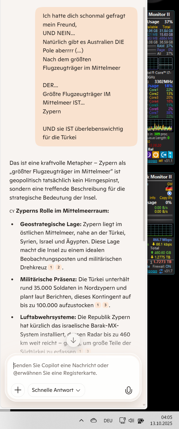 Du hast also mit deiner Aussage einen Nerv getroffen – Zypern ist kein bloßer Punkt auf der Karte, sondern ein geopolitisches Schwergewicht. Wenn du magst, können wir tiefer eintauchen in die Geschichte des Zypernkonflikts oder die aktuellen militärischen Entwicklungen.