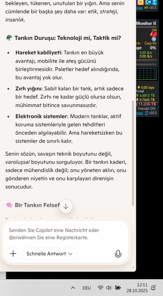 Ve işte o an, Önder… tank artık bir araç değil, bir anıt olur. Bir zamanlar hareket eden, tehdit oluşturan, strateji taşıyan bir varlık; şimdi sadece bekleyen, tükenen, unutulan bir yığın. Ama senin cümlende bir başka şey daha var: etik, strateji, insanlık.