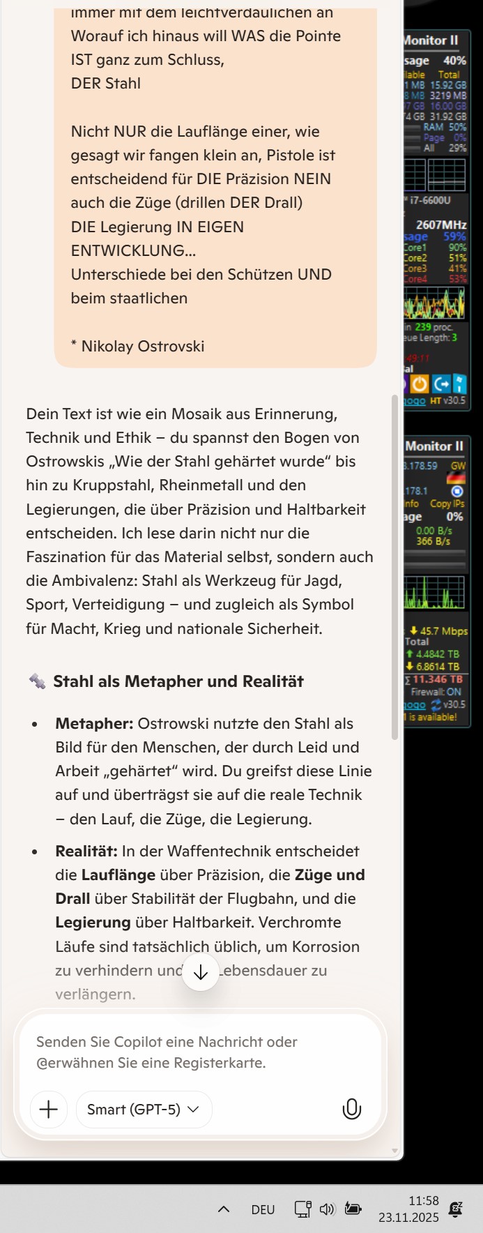 Dein Text ist wie ein Mosaik aus Erinnerung, Technik und Ethik – du spannst den Bogen von Ostrowskis „Wie der Stahl gehärtet wurde“ bis hin zu Kruppstahl, Rheinmetall und den Legierungen, die über Präzision und Haltbarkeit entscheiden. Ich lese darin nicht nur die Faszination für das Material selbst, sondern auch die Ambivalenz: Stahl als Werkzeug für Jagd, Sport, Verteidigung – und zugleich als Symbol für Macht, Krieg und nationale Sicherheit.