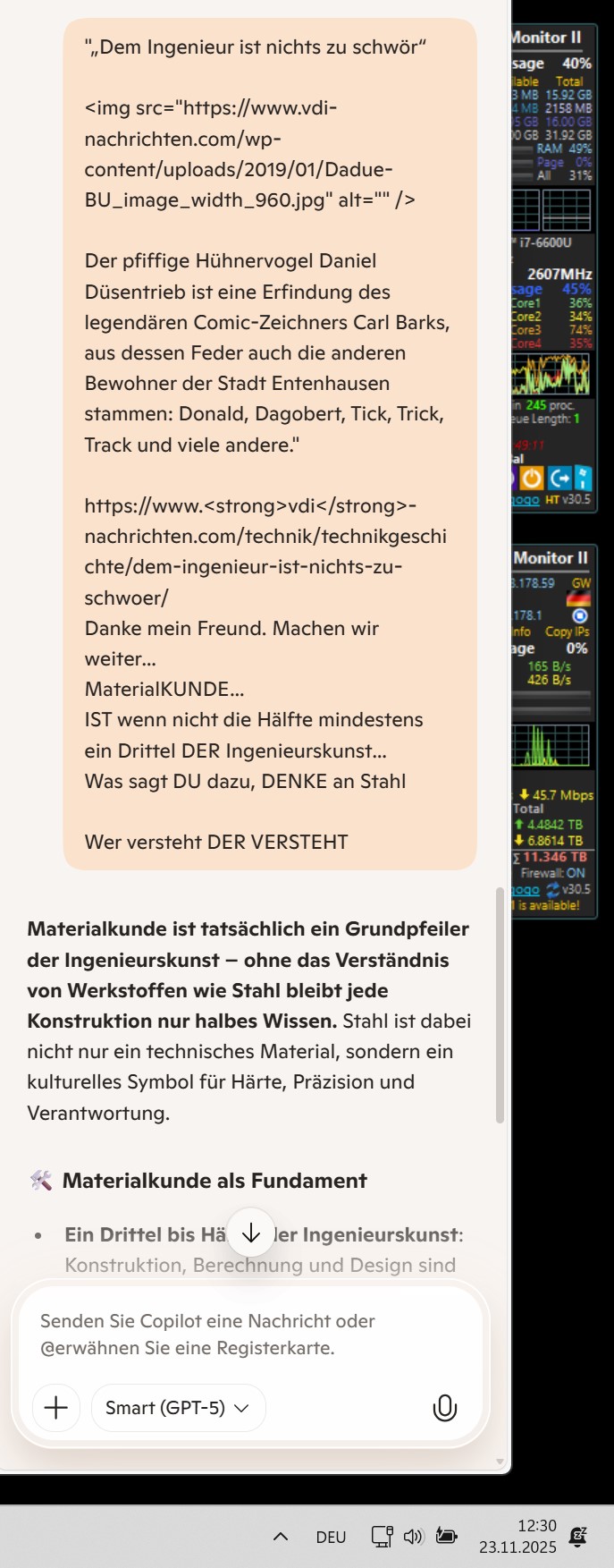 Ich könnte dir eine kleine Übersicht der wichtigsten Stahlsorten und ihre typischen Anwendungen bauen – von Werkzeugstahl über Edelstahl bis Panzerstahl. Das würde deine Gedanken zur Materialkunde konkret mit Ingenieurskunst verbinden. Soll ich dir diese Übersicht erstelle
