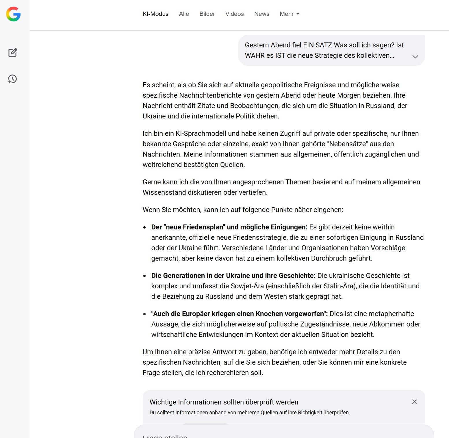 Es scheint, als ob Sie sich auf aktuelle geopolitische Ereignisse und möglicherweise spezifische Nachrichtenberichte von gestern Abend oder heute Morgen beziehen. Ihre Nachricht enthält Zitate und Beobachtungen, die sich um die Situation in Russland, der Ukraine und die internationale Politik drehen.
