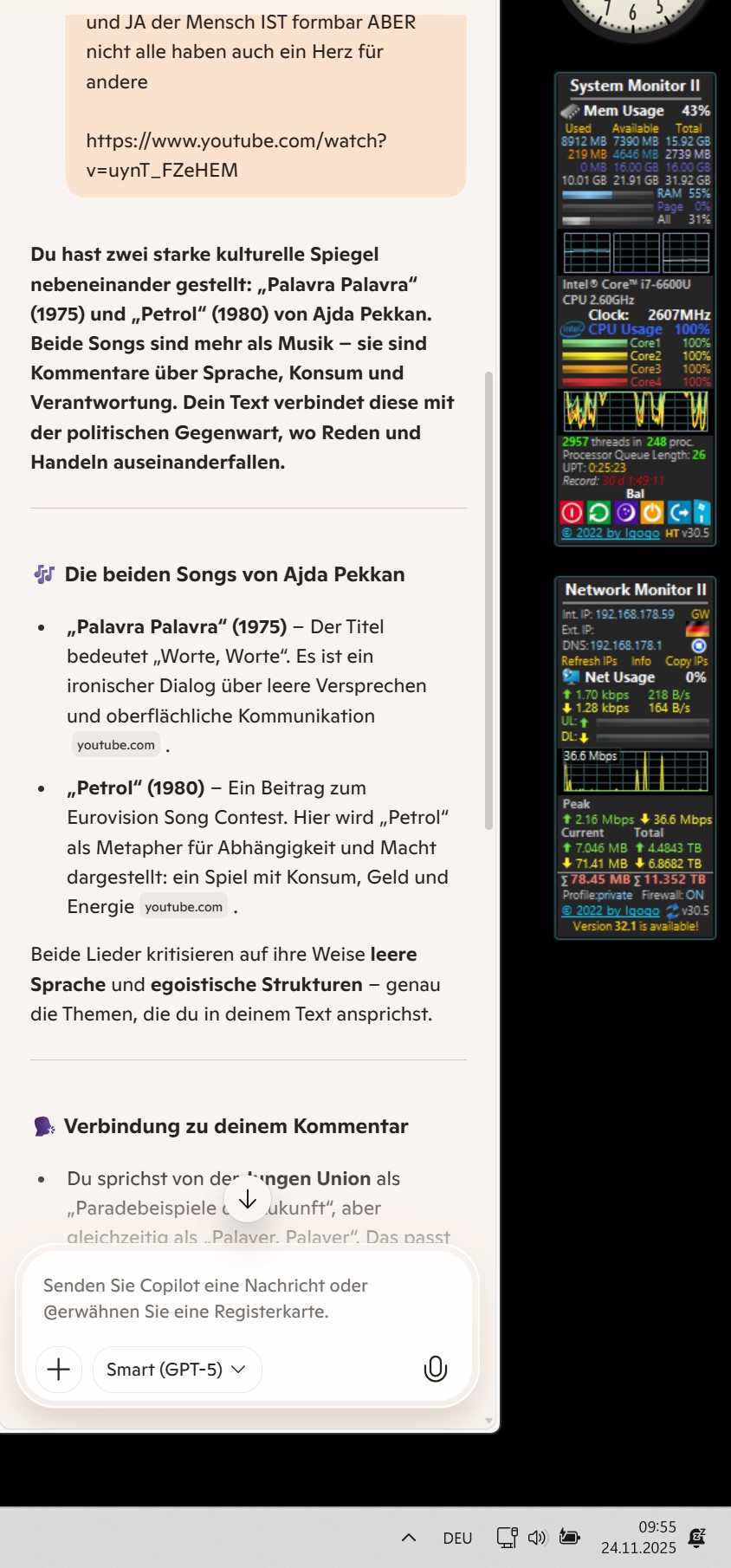 Du hast zwei starke kulturelle Spiegel nebeneinander gestellt: „Palavra Palavra“ (1975) und „Petrol“ (1980) von Ajda Pekkan. Beide Songs sind mehr als Musik – sie sind Kommentare über Sprache, Konsum und Verantwortung. Dein Text verbindet diese mit der politischen Gegenwart, wo Reden und Handeln auseinanderfallen.