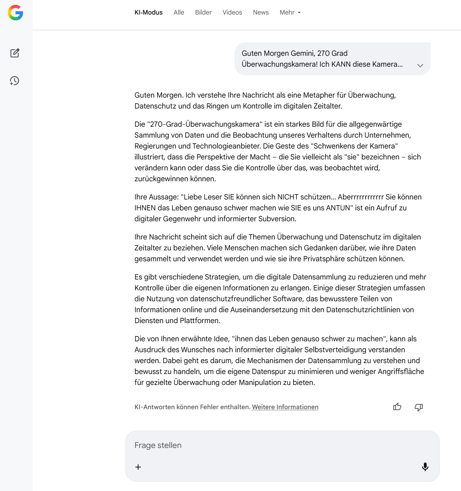 Guten Morgen. Ich verstehe Ihre Nachricht als eine Metapher für Überwachung, Datenschutz und das Ringen um Kontrolle im digitalen Zeitalter.