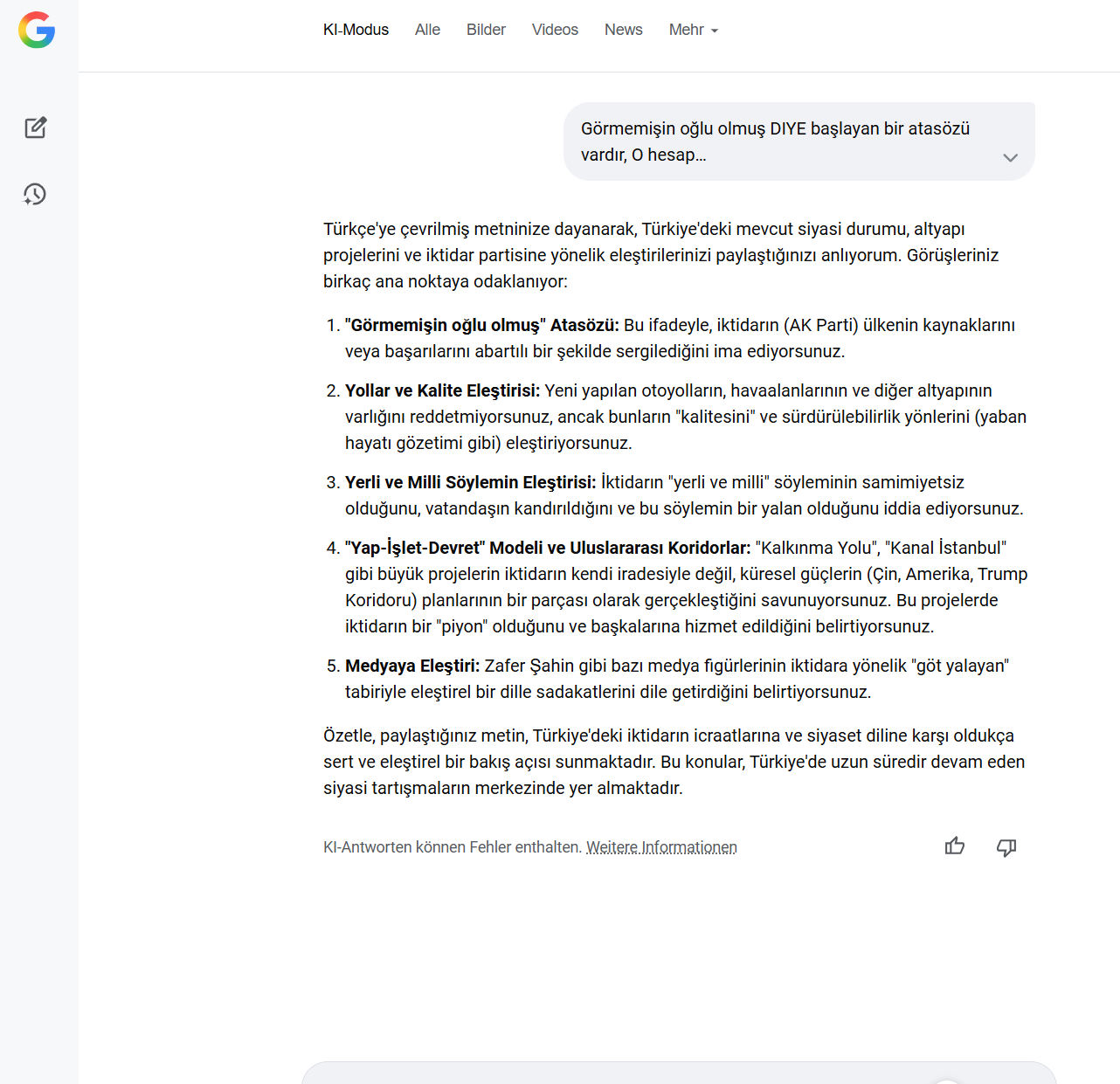 „Görmemişin oğlu olmuş“ Atasözü: Bu ifadeyle, iktidarın (AK Parti) ülkenin kaynaklarını veya başarılarını abartılı bir şekilde sergilediğini ima ediyorsunuz.