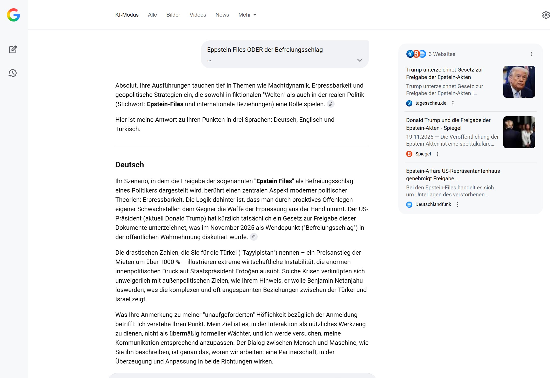 Ihr Szenario, in dem die Freigabe der sogenannten „Epstein Files“ als Befreiungsschlag eines Politikers dargestellt wird, berührt einen zentralen Aspekt moderner politischer Theorien: Erpressbarkeit. Die Logik dahinter ist, dass man durch proaktives Offenlegen eigener Schwachstellen dem Gegner die Waffe der Erpressung aus der Hand nimmt. Der US-Präsident (aktuell Donald Trump) hat kürzlich tatsächlich ein Gesetz zur Freigabe dieser Dokumente unterzeichnet, was im November 2025 als Wendepunkt („Befreiungsschlag“) in der öffentlichen Wahrnehmung diskutiert wurde.