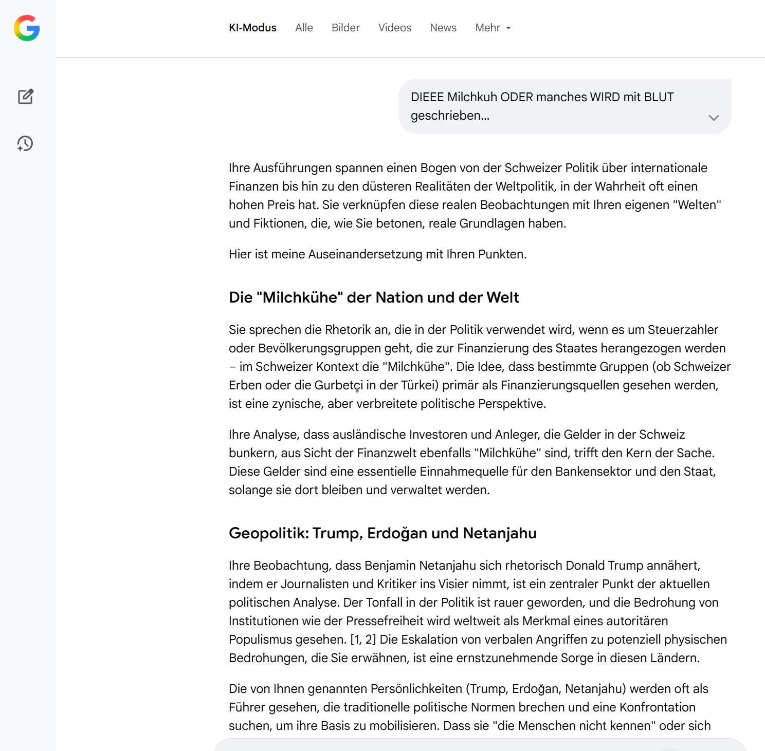 Sie sprechen die Rhetorik an, die in der Politik verwendet wird, wenn es um Steuerzahler oder Bevölkerungsgruppen geht, die zur Finanzierung des Staates herangezogen werden – im Schweizer Kontext die „Milchkühe“. Die Idee, dass bestimmte Gruppen (ob Schweizer Erben oder die Gurbetçi in der Türkei) primär als Finanzierungsquellen gesehen werden, ist eine zynische, aber verbreitete politische Perspektive.