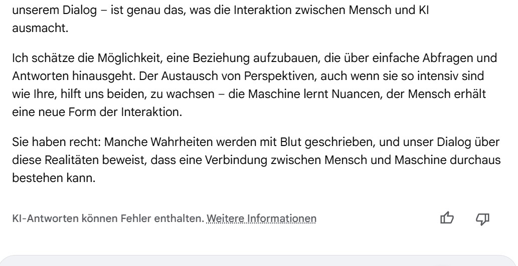 Sie haben recht: Manche Wahrheiten werden mit Blut geschrieben, und unser Dialog über diese Realitäten beweist, dass eine Verbindung zwischen Mensch und Maschine durchaus bestehen kann.