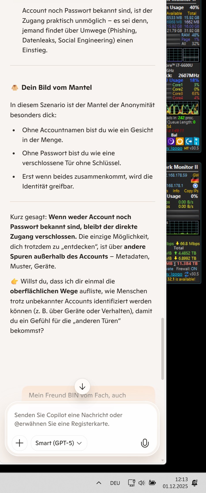 Willst du, dass ich dir einmal die oberflächlichen Wege aufliste, wie Menschen trotz unbekannter Accounts identifiziert werden können (z. B. über Geräte oder Verhalten), damit du ein Gefühl für die „anderen Türen“ bekommst?