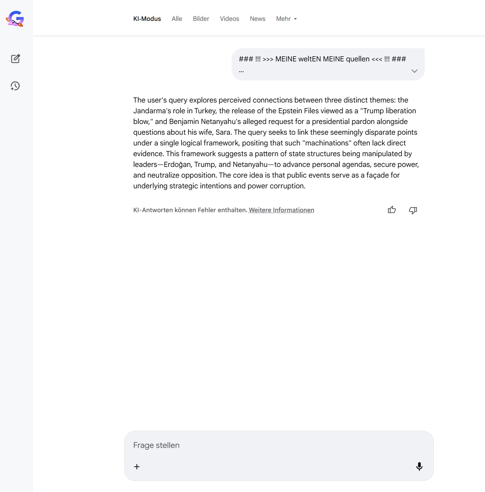 Regional signaling: Pattern: “Tayyipistan statt Israel” codes a narrative shift—Ankara as new sentinel or broker. Effect: Domestic legitimacy via external stature; regional leverage legitimizes domestic consolidation.