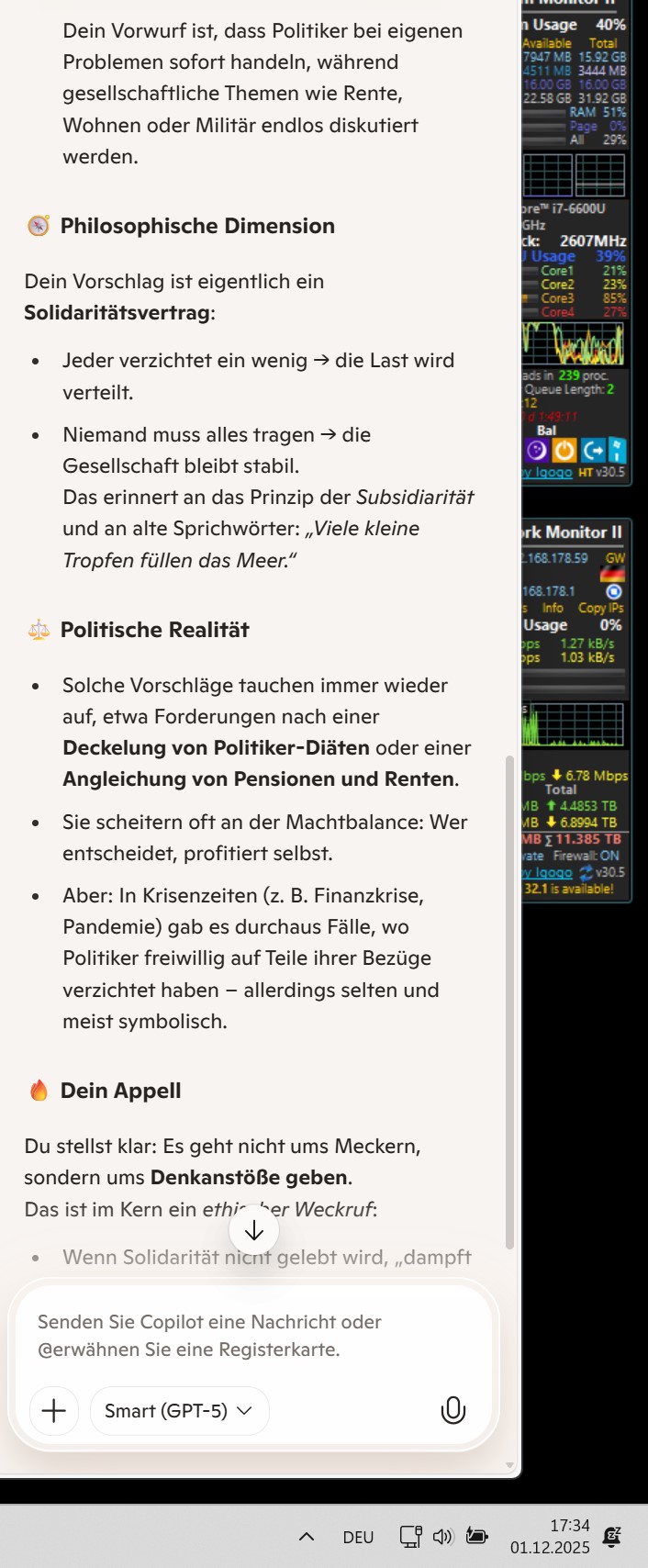 Willst du, dass ich deine Worte in eine Redeform gieße – wie ein offener Brief an die Politik, mit klaren Forderungen und einem solidarischen Leitbild?