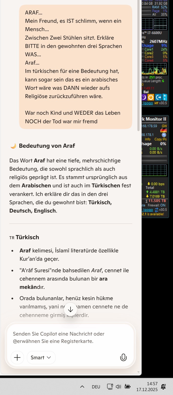 Das Wort Araf hat eine tiefe, mehrschichtige Bedeutung, die sowohl sprachlich als auch religiös geprägt ist. Es stammt ursprünglich aus dem Arabischen und ist auch im Türkischen fest verankert. Ich erkläre dir das in den drei Sprachen, die du gewohnt bist: Türkisch, Deutsch, Englisch.
