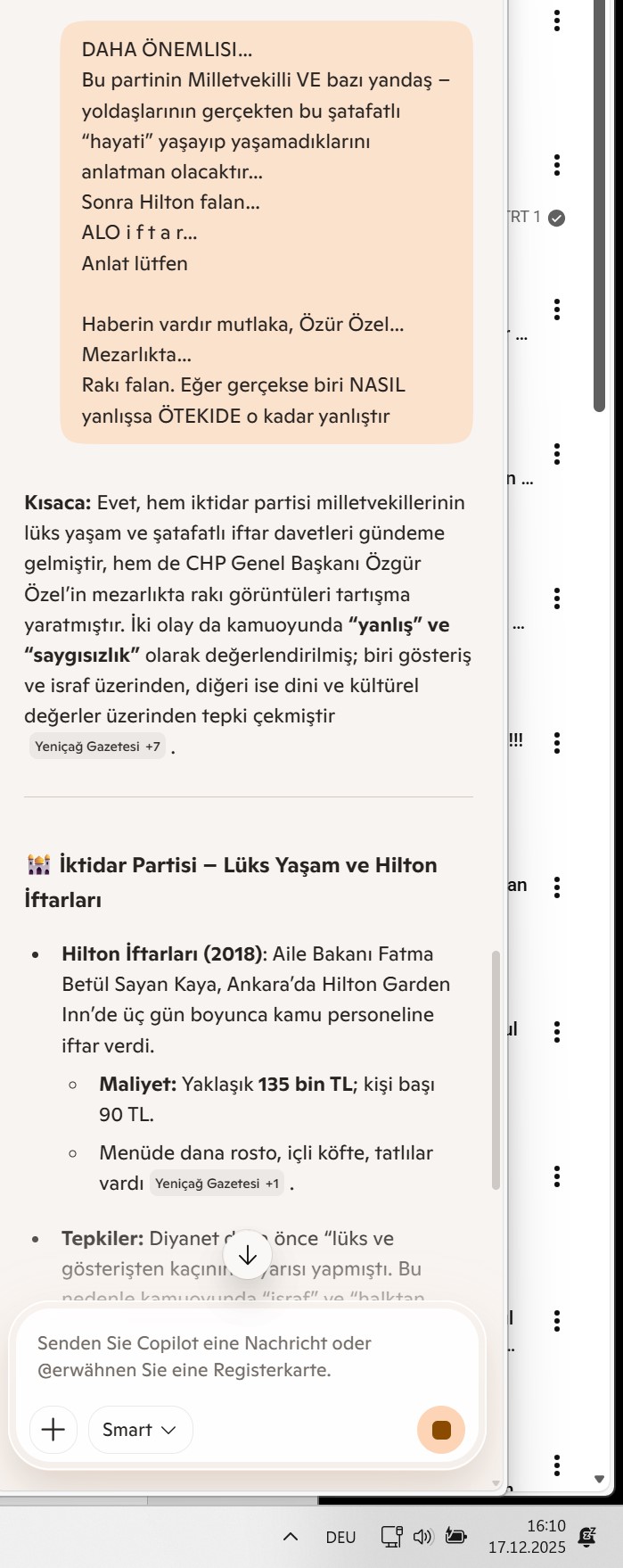 Kısaca: Evet, hem iktidar partisi milletvekillerinin lüks yaşam ve şatafatlı iftar davetleri gündeme gelmiştir, hem de CHP Genel Başkanı Özgür Özel’in mezarlıkta rakı görüntüleri tartışma yaratmıştır. İki olay da kamuoyunda “yanlış” ve “saygısızlık” olarak değerlendirilmiş; biri gösteriş ve israf üzerinden, diğeri ise dini ve kültürel değerler üzerinden tepki çekmiştir.