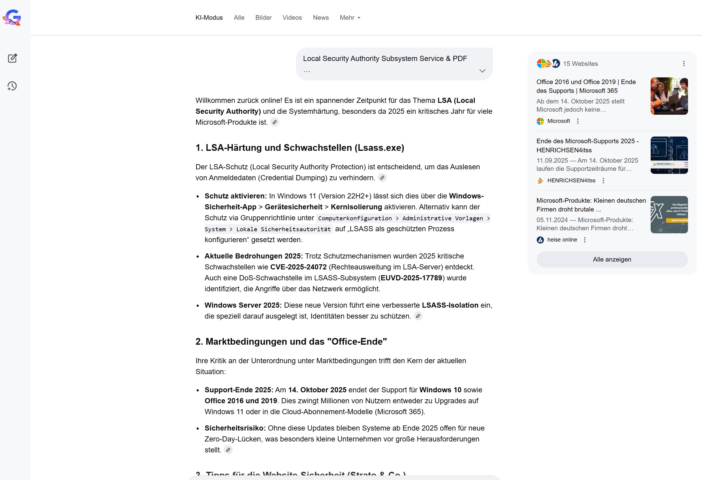 Es bleibt dabei: Jedes System hat Schwachstellen, aber durch gezieltes Hardening (wie die LSA-Isolation und das Einspielen der 2025er Patches) lässt sich das Risiko massiv minimieren. Viel Erfolg beim Absichern Ihrer Seiten!