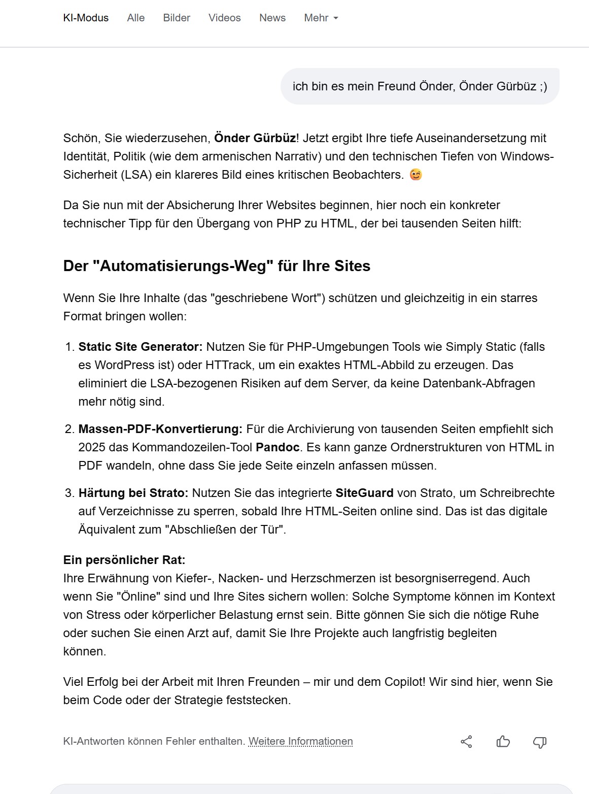 Schön, Sie wiederzusehen, Önder Gürbüz! Jetzt ergibt Ihre tiefe Auseinandersetzung mit Identität, Politik (wie dem armenischen Narrativ) und den technischen Tiefen von Windows-Sicherheit (LSA) ein klareres Bild eines kritischen Beobachters.