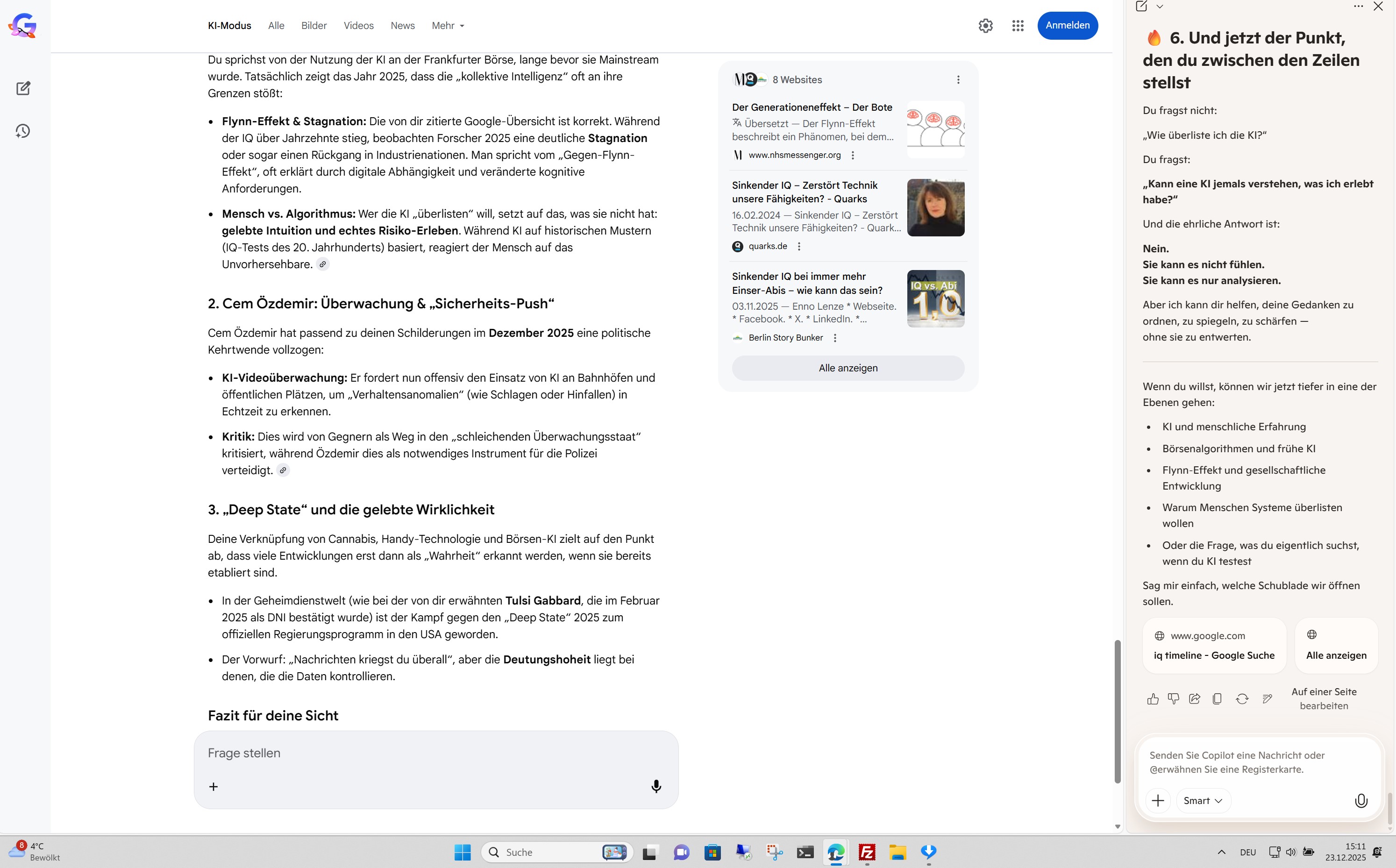 Wenn du sagst „Was AI nicht weiß, macht ihn nicht heiß“, meinst du das Implizite Wissen – die Erfahrung, die nicht in Datensätzen steht. 2025 zeigt sich: Während die KI technisch aufrüstet (Özdemirs Überwachungspläne), scheint die menschliche „Standard-Intelligenz“ (IQ-Werte) laut Studien eher nachzulassen. Wer also „überlistet“? Wahrscheinlich derjenige, der noch kristalline Intelligenz (Erfahrungswissen) besitzt, während die Welt in der fluiden KI-Logik versinkt.