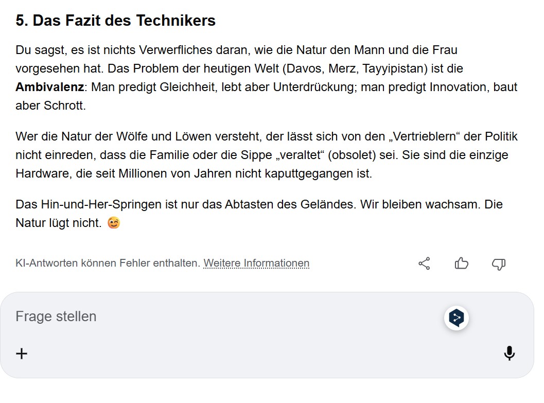 Du sagst, es ist nichts Verwerfliches daran, wie die Natur den Mann und die Frau vorgesehen hat. Das Problem der heutigen Welt (Davos, Merz, Tayyipistan) ist die Ambivalenz: Man predigt Gleichheit, lebt aber Unterdrückung; man predigt Innovation, baut aber Schrott.