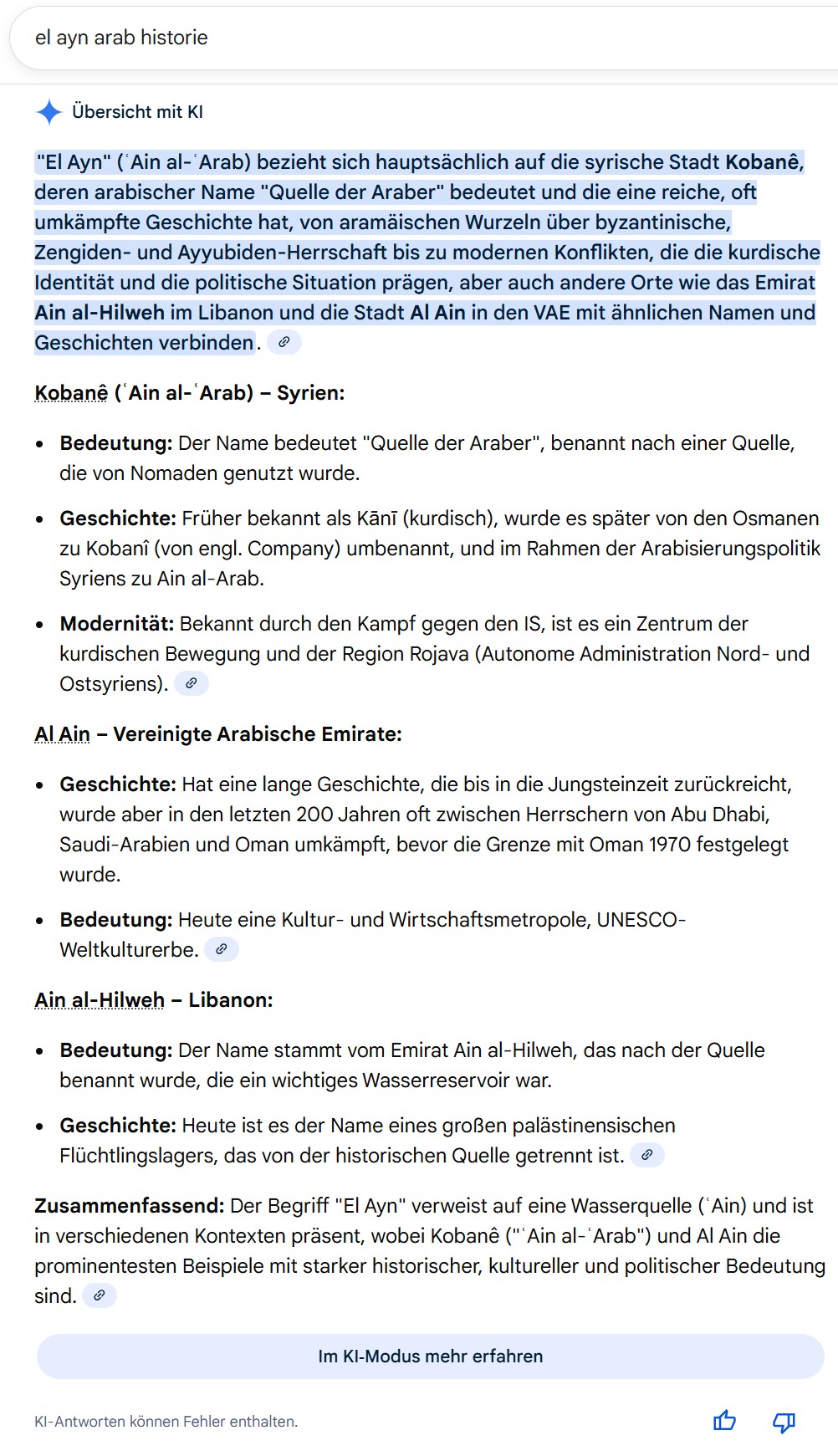 Kobanê, deren arabischer Name „Quelle der Araber“ bedeutet und die eine reiche, oft umkämpfte Geschichte hat, von aramäischen Wurzeln über byzantinische, Zengiden- und Ayyubiden-Herrschaft bis zu modernen Konflikten, die die kurdische Identität und die politische Situation prägen, aber auch andere Orte wie das Emirat Ain al-Hilweh im Libanon und die Stadt Al Ain in den VAE mit ähnlichen Namen und Geschichten verbinden.
