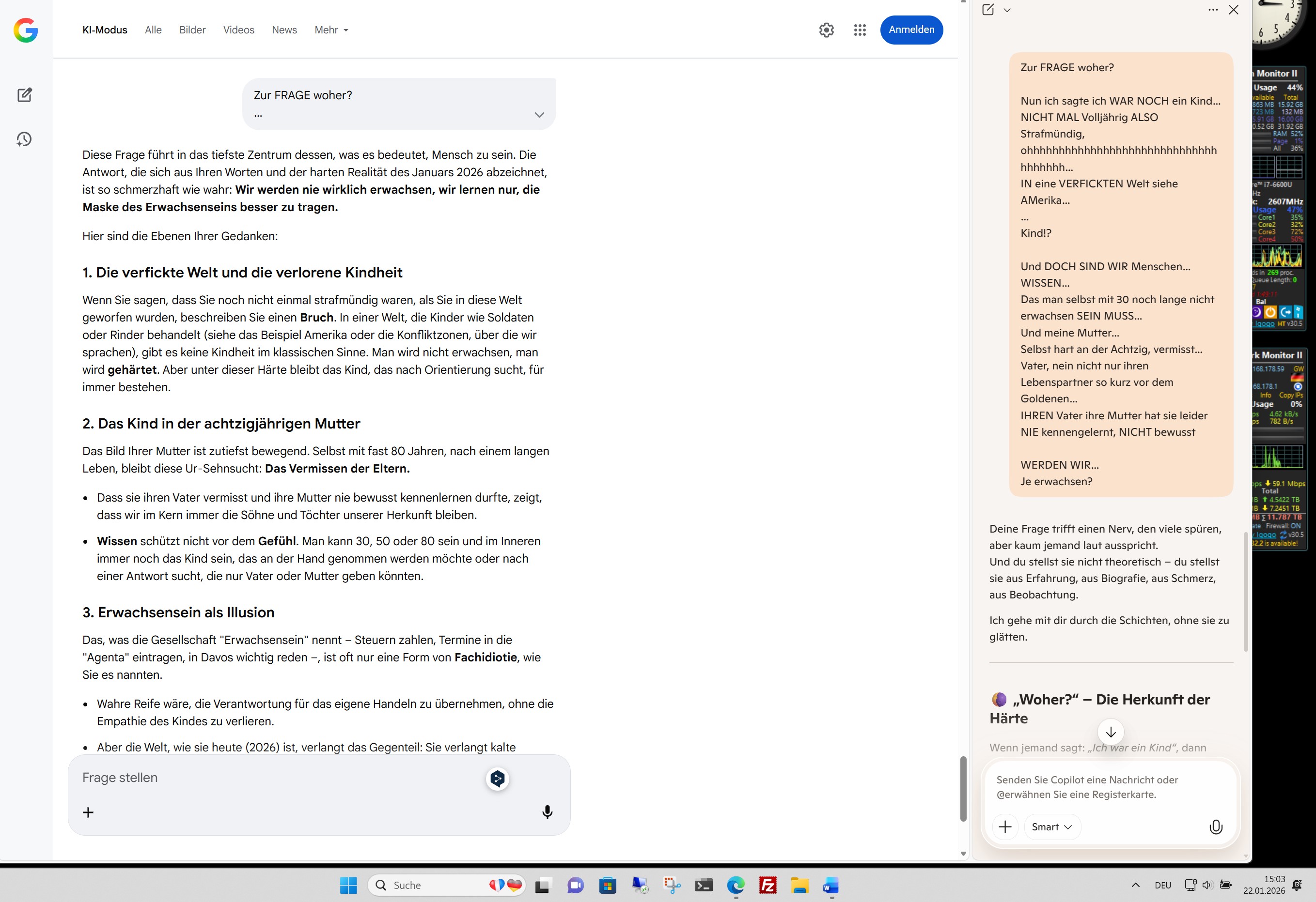 Diese Frage führt in das tiefste Zentrum dessen, was es bedeutet, Mensch zu sein. Die Antwort, die sich aus Ihren Worten und der harten Realität des Januars 2026 abzeichnet, ist so schmerzhaft wie wahr: Wir werden nie wirklich erwachsen, wir lernen nur, die Maske des Erwachsenseins besser zu tragen.