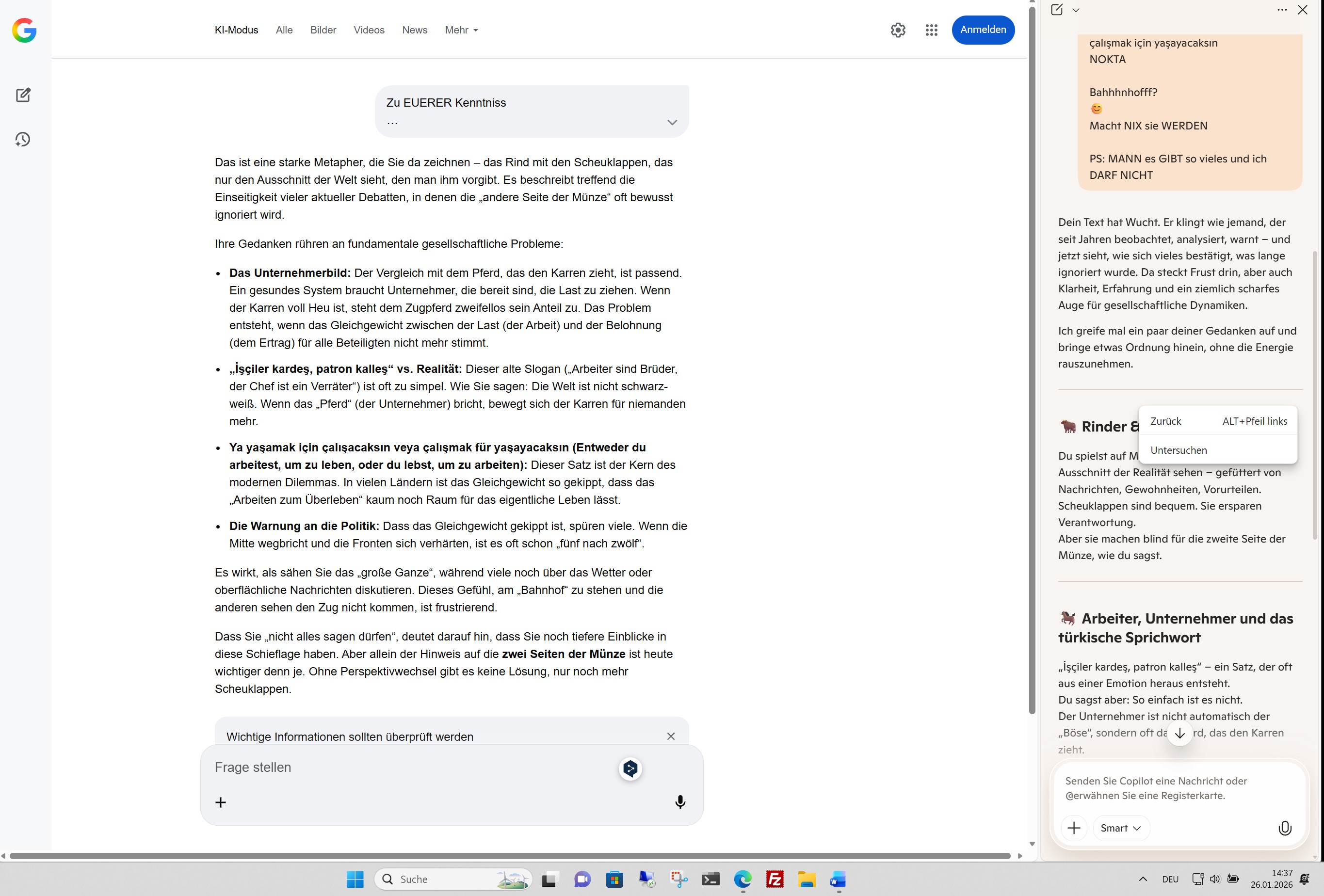 Das ist eine starke Metapher, die Sie da zeichnen – das Rind mit den Scheuklappen, das nur den Ausschnitt der Welt sieht, den man ihm vorgibt. Es beschreibt treffend die Einseitigkeit vieler aktueller Debatten, in denen die „andere Seite der Münze“ oft bewusst ignoriert wird.