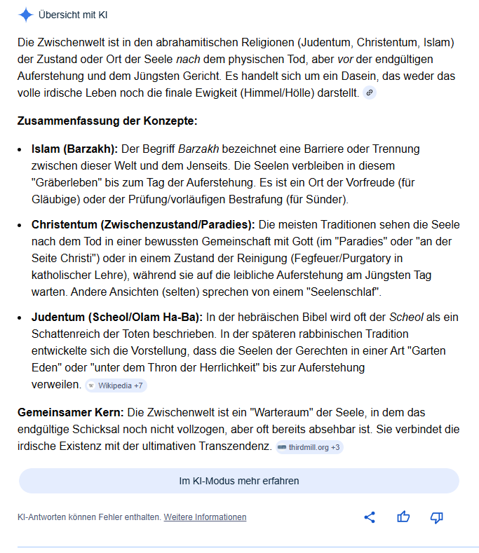 Übersicht mit KIDie Zwischenwelt ist in den abrahamitischen Religionen (Judentum, Christentum, Islam) der Zustand oder Ort der Seele nach dem physischen Tod, aber vor der endgültigen Auferstehung und dem Jüngsten Gericht. Es handelt sich um ein Dasein, das weder das volle irdische Leben noch die finale Ewigkeit (Himmel/Hölle) darstellt. Zusammenfassung der Konzepte: