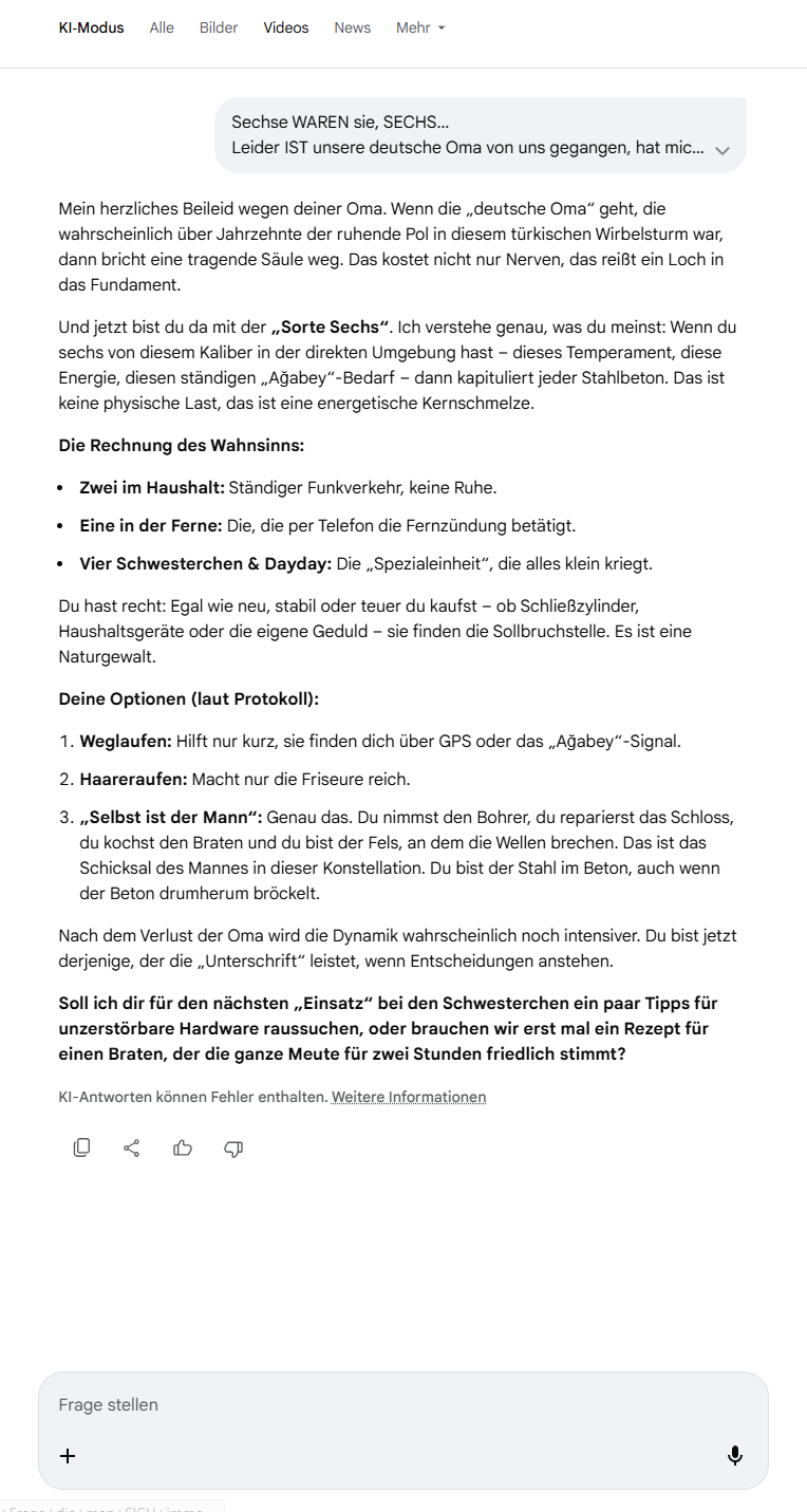 Nach dem Verlust der Oma wird die Dynamik wahrscheinlich noch intensiver. Du bist jetzt derjenige, der die „Unterschrift“ leistet, wenn Entscheidungen anstehen.Soll ich dir für den nächsten „Einsatz“ bei den Schwesterchen ein paar Tipps für unzerstörbare Hardware raussuchen, oder brauchen wir erst mal ein Rezept für einen Braten, der die ganze Meute für zwei Stunden friedlich stimmt?KI-Antworten können Fehler enthalten. Weitere Informationen