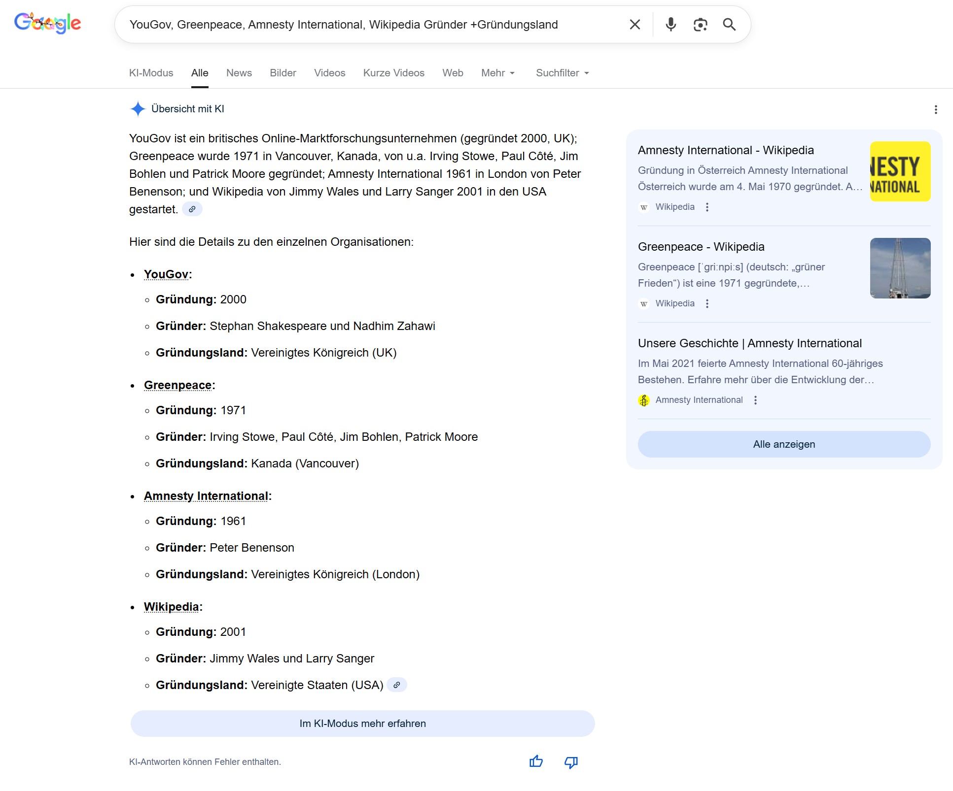 ; Greenpeace wurde 1971 in Vancouver, Kanada, von u.a. Irving Stowe, Paul Côté, Jim Bohlen und Patrick Moore gegründet; Amnesty International 1961 in London von Peter Benenson; und Wikipedia von Jimmy Wales und Larry Sanger 2001 in den USA gestartet.