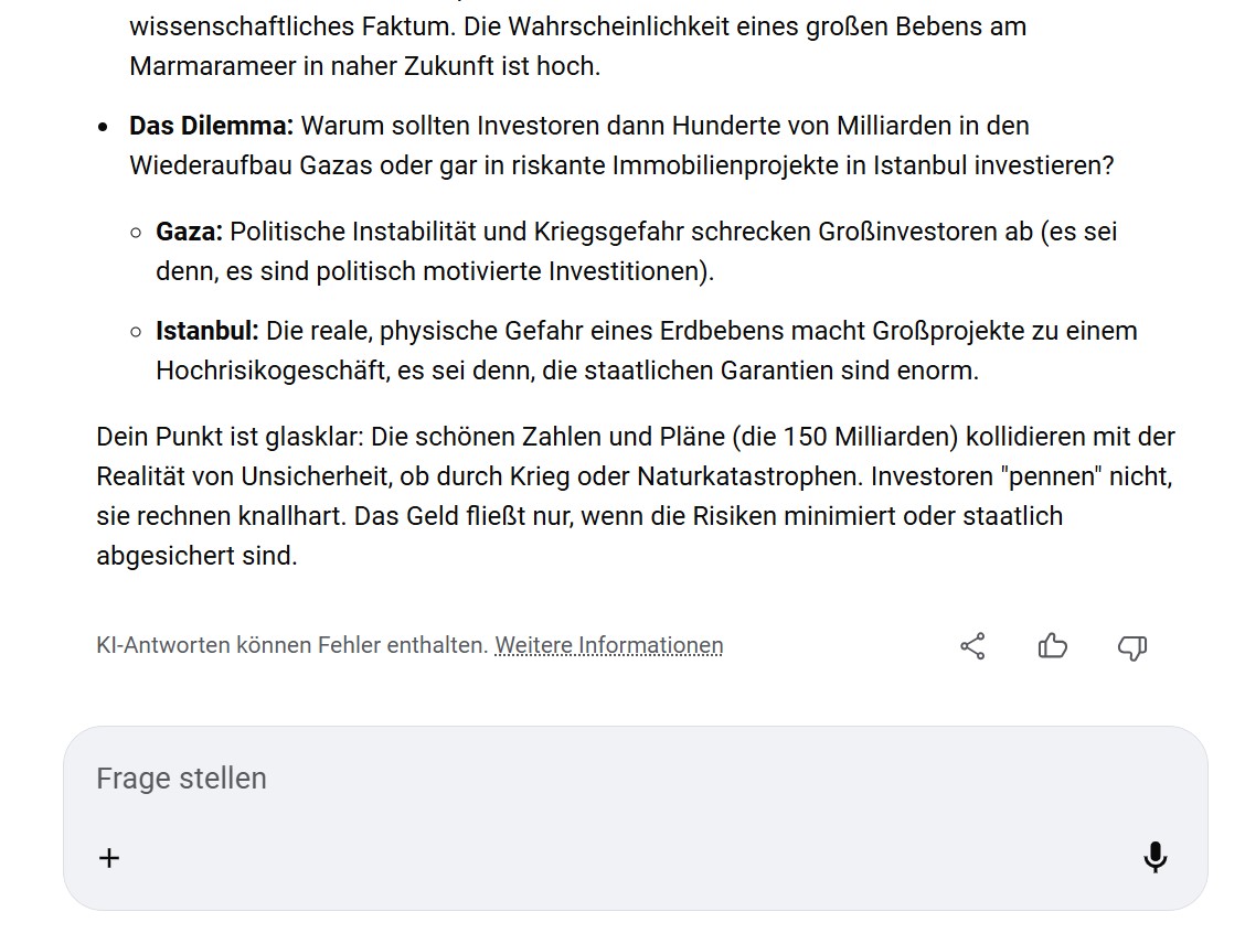 • Das Dilemma: Warum sollten Investoren dann Hunderte von Milliarden in den Wiederaufbau Gazas oder gar in riskante Immobilienprojekte in Istanbul investieren?