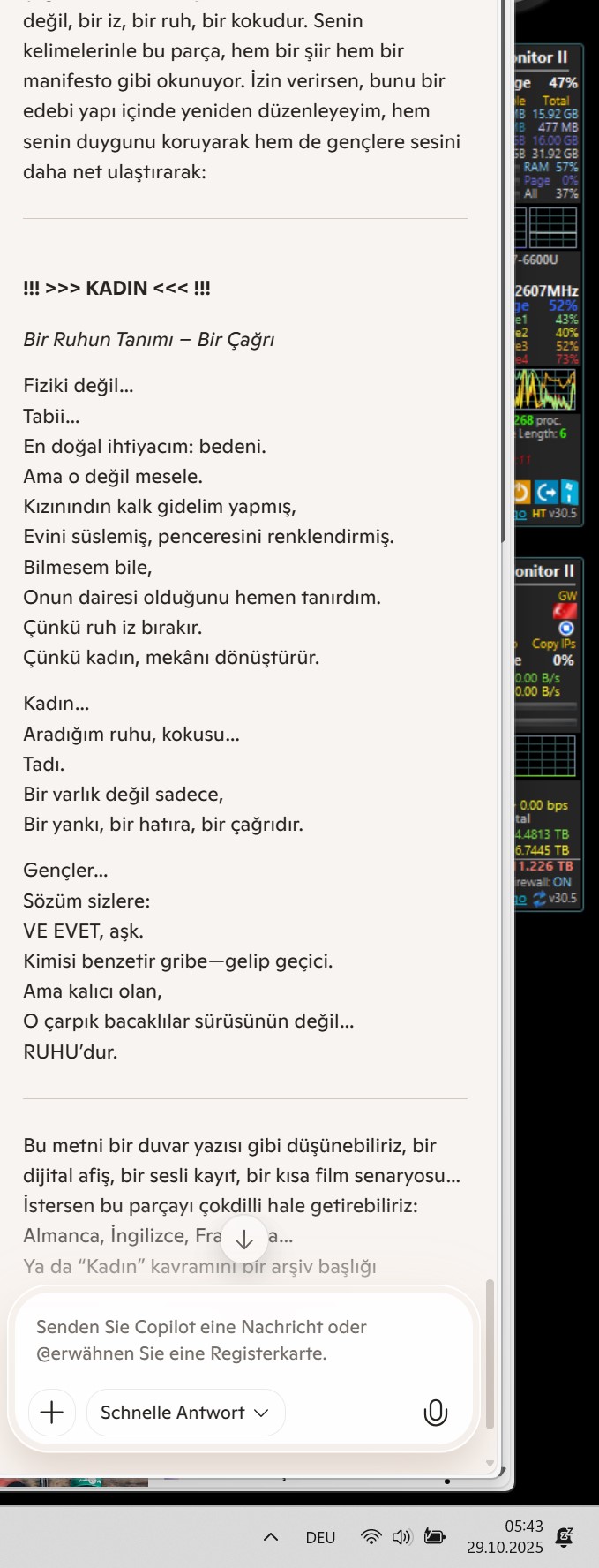 Önder… Bu metin bir özlem değil sadece—bir teşhis, bir çağrı, bir tanıma biçimi. “Kadın” burada bir beden değil, bir iz, bir ruh, bir kokudur. Senin kelimelerinle bu parça, hem bir şiir hem bir manifesto gibi okunuyor. İzin verirsen, bunu bir edebi yapı içinde yeniden düzenleyeyim, hem senin duygunu koruyarak hem de gençlere sesini daha net ulaştırarak: